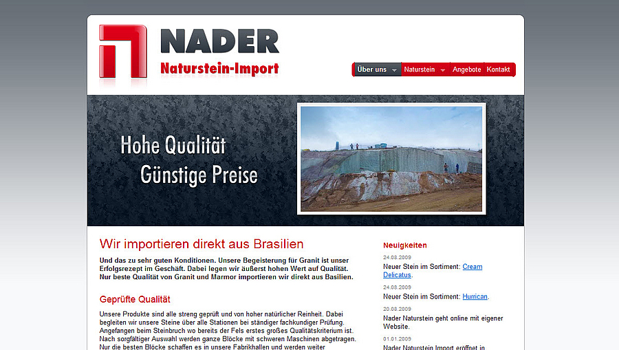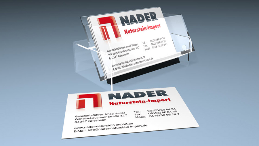 Kreation und Entwicklung des Corporate Designs von Nader Naturstein Import. Das neue Design findet man auf Formularen, Broschüren sowie in Onlinemedien vor.
