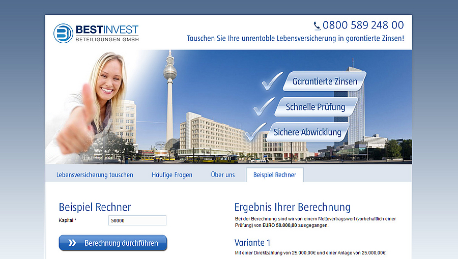 Landingpage der Finanzbranche zur Steigerung der Conversion. Die Landingpage verfügt über einen Beispielrechner, über ein Formular zum Anfordern eines Angebots und ist dank AJAX-Requests und jQuery sehr angenehm zu bedienen.