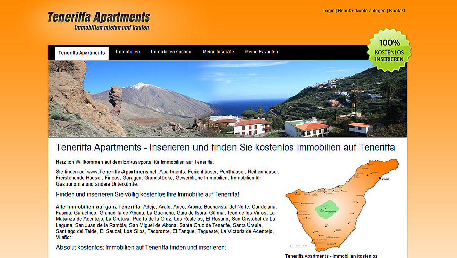Konzeption und Gestaltung des Immobilien-Portals für Teneriffa. Besucher können sich registrieren und selbst ihre Immobilien inserieren und verwalten. Das Portal wurde mittels TYPO3 realisiert.