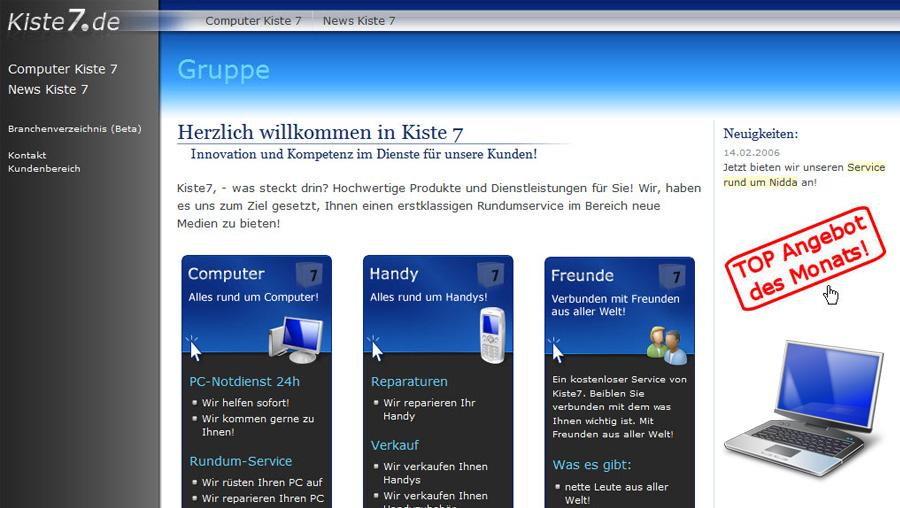 Konzeption und Gestaltung eines hochwertigen Webdesigns für die Gruppenseite des Dienstleistungsunternehmens Kiste7.