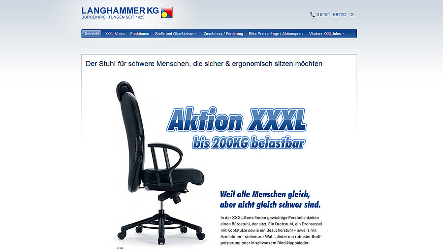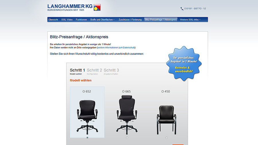 Webdesign und Gestaltung einer Landingpage für hochwertige Bürostühle. Inkl. Content-Management-System Contao und entwickeltem online Produktkonfigurator.
